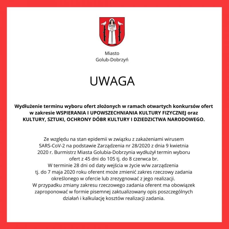 Zarządzenia w sprawie: powołania komisji konkursowej, zasad, kryteriów i trybu wyboru ofert złożonych przez organizacje pozarządowe i inne podmioty działalności pożytku publicznego, ubiegające się o dotację z budżetu Gminy Miasto Golub-Dobrzyń oraz określenia przez Komisję propozycji kwot dotacji dla wyłonionych w drodze konkursu nr 2/2020 oferentów, którzy realizować będą zadania własne Gminy w zakresie kultury, sztuki, ochrony dóbr kultury i dziedzictwa narodowego.Oraz drodze konkursu nr 1/2020 oferentów, którzy realizować będą zadania własne Gminy w zakresie wspierania i upowszechniania kultury fizycznej.